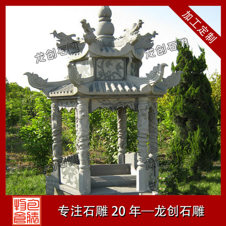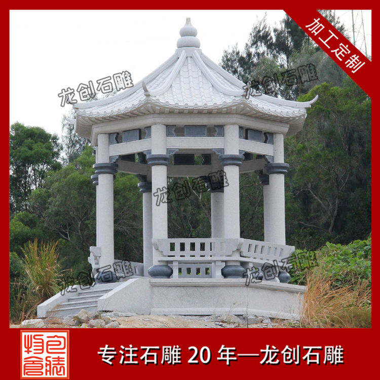 在所設(shè)計(jì)的園林石雕涼亭中,能夠欣賞到外部周?chē)h(huán)境的景色,這就要求園林石涼亭的墻體不宜做封閉,要適當(dāng)開(kāi)闊,亭柱之間不做過(guò)多的裝飾,只是在和亭頂?shù)逆溄硬课话惭b雀替、佳落等裝飾,一方面對(duì)亭頂有良好的支撐作用,另一方面起到裝飾石涼亭的作用。