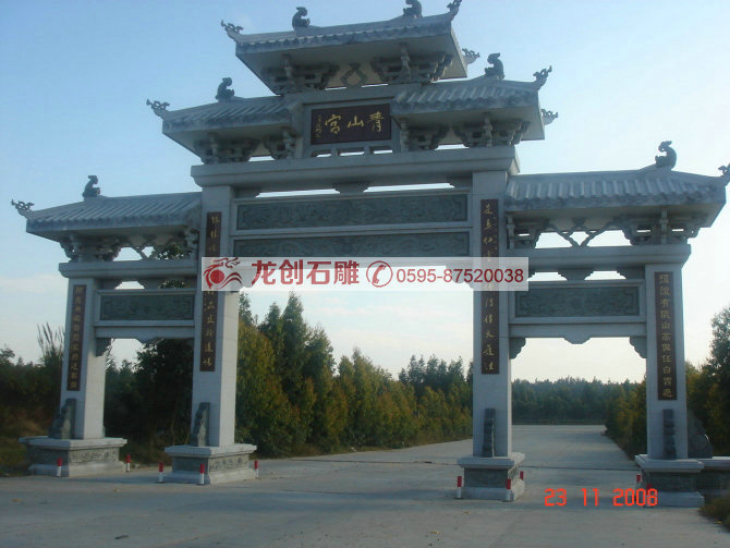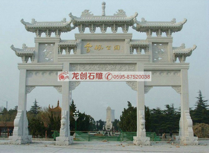 門樓牌坊是石牌樓中的一種,門樓牌坊與石牌樓相比,門樓牌坊在雕刻的時候沒有石牌樓那樣的復(fù)雜化,主要是因為石牌坊沒有石牌樓上面的那些斗拱和樓子。門樓牌坊是一種具有紀念性的獨特的建筑物,從門樓牌坊的建造意圖來說,可以分為三類:一類為標志性;二類為陵園牌坊;三類為紀念性的,根據(jù)想表達的意圖來建筑不同的牌坊。在現(xiàn)代,門樓牌坊擺放一般用來表彰與紀念人物或表示美觀的建筑物,多建在市街、鄉(xiāng)村、家祠、寺院、道觀、景區(qū)、學(xué)校等處。石雕牌樓,石牌坊
