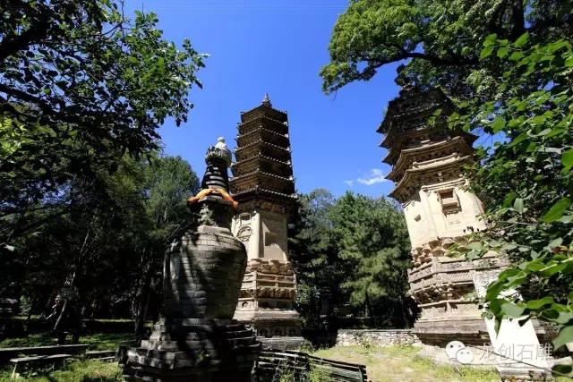 潭柘古剎,歷經(jīng)了十多個朝代,規(guī)模宏大,曾有難以數(shù)計的僧人在這里修行,并終老于此,因而在寺院附近留下了數(shù)量眾多的僧人墓塔。如今在寺前的塔林內(nèi)完好的保存著形式多樣的歷代佛塔七十余座。下塔院的塔林埋葬著金、元、明三代的部分高僧,塔形不一,種類較多,有石經(jīng)幢式塔、方形單層浮層屠式塔、密檐式磚塔和覆缽形藏式石塔。塔林中最高大的墓塔要數(shù)金代的廣慧通理禪師塔,此塔位于下塔院的中心,塔高九層,也是密檐式實心磚塔,塔前設(shè)有寬大的石供桌,塔前左右兩側(cè)還各有一株千年娑羅樹。