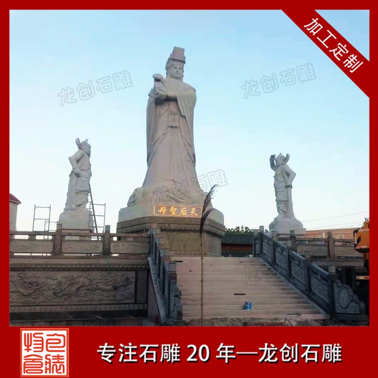石雕媽祖,又稱(chēng)天妃、天后、天后圣母、娘媽?zhuān)菤v代船工、海員、旅客、商人和漁民共同信奉的道教神祇。古代在海上航行經(jīng)常受到風(fēng)浪的襲擊而船沉人亡,船員的安全成航海者的主要問(wèn)題,他們把希望寄托于神靈的保佑。為此建立石雕媽祖像,在船舶啟航前要先祭天妃,祈求保佑順風(fēng)和安全,在船舶上還立天妃神位供奉。