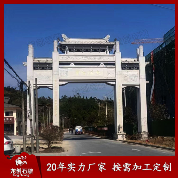 中西方風(fēng)格融合的現(xiàn)代造型設(shè)計(jì)石牌坊,選用傳統(tǒng)式的石牌坊制作樣式,在建筑類(lèi)型上結(jié)合歐式古典的設(shè)計(jì)構(gòu)思,種風(fēng)格的牌坊看起來(lái)豪華而壯觀。許多現(xiàn)代化的鄉(xiāng)鎮(zhèn)喜歡選擇這種類(lèi)型的牌坊。