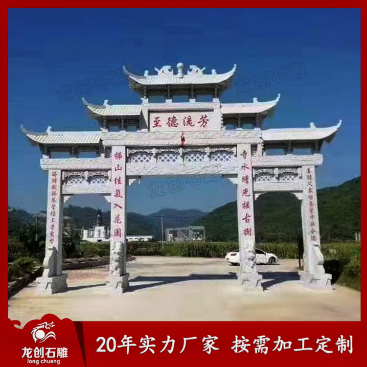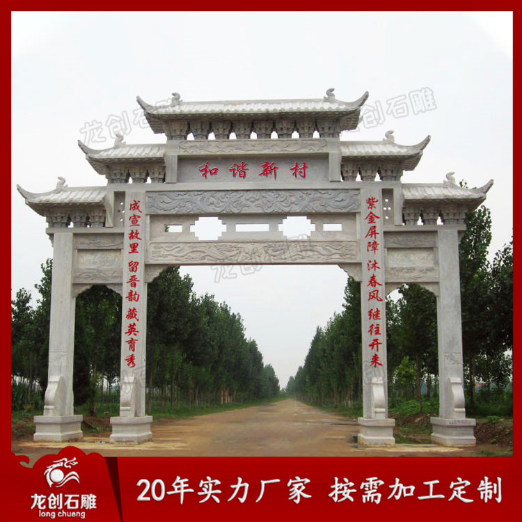 三門石雕牌坊在農(nóng)村地區(qū)也是比較常見的,三門五樓牌坊定制也比較多,尤其是現(xiàn)代一些新農(nóng)村建設(shè)中更是經(jīng)常可以看到這類三門石牌坊設(shè)計的農(nóng)村石牌坊。農(nóng)村地區(qū)的牌坊通常起到了標(biāo)志地名以及裝飾性作用,在實際雕刻的時候應(yīng)當(dāng)要考慮到農(nóng)村地區(qū)的特色以及風(fēng)土人情等情況,從而能夠雕刻出更為精致的石雕牌坊作品,展現(xiàn)牌坊的建筑之美。