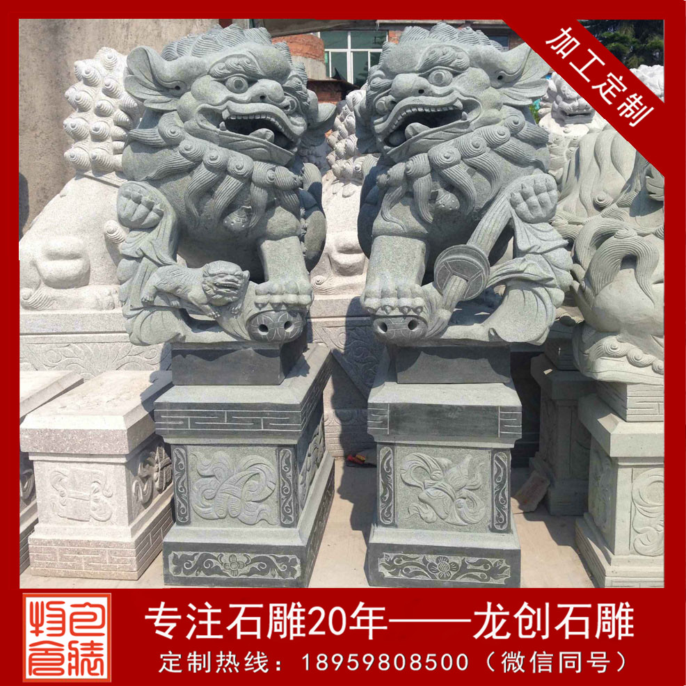 石獅子的造型一般尊嚴而又大氣,是皇jia守衛(wèi)門戶確保皇宮安寧的瑞獸,因為獅子是獸中zhi王,它體態(tài)壯碩雄健、威錳無比、氣勢非常。統(tǒng)治者認為獅子不但可以避邪,還可帶來祥瑞之氣。石雕北京獅為雌雄一對,獅頭飾鬃髦,頸懸響鈴,肌肉發(fā)達,氣勢雄偉。雌獅前左腳下有一幼獅仰臥作嬉戲狀,雄獅前右腳撫踩一繡球。底座有繁縟精致的卷葉紋。石雕北京獅瑞獸一種,百獸zhi王,勇不可擋,威震四方,不但可以避邪,且可帶來祥瑞之氣,能解除多種形煞,亦加強官威或屋主之陽氣,如果窗口見到不利之沖克,如沖煞、天斬煞等,可放一對石獅面向口可化煞,且有生權之意,適合官職人員擺放,古時衙門前就是擺放獅子鎮(zhèn)守。
