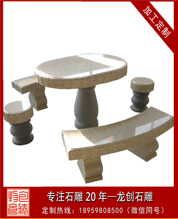 利用石材的石桌椅雖然堅(jiān)硬,但是可塑性強(qiáng),不易損壞,可制作造型多樣的石桌椅。最為簡(jiǎn)單的石桌椅有由簡(jiǎn)單修飾的圓柱坐凳與圓板組成的一組石桌椅,還有用幾塊石板組成的石靠背椅、長(zhǎng)椅或者單椅等。還可以做進(jìn)一步雕塑,可江坐凳打磨成葫蘆形或者雕塑各種花紋,還可將坐凳雕塑成動(dòng)物坐凳、手坐凳等其他藝術(shù)造型。靠背椅還可仿沙發(fā)形狀來(lái)進(jìn)行雕塑,可長(zhǎng)方形也可做成弧形。長(zhǎng)椅不單可做直線,也可做曲線,整石打磨或者把兩側(cè)做成動(dòng)物造型。而單椅能雕刻成各種各樣動(dòng)物造型,還能根據(jù)需要來(lái)選擇大小。